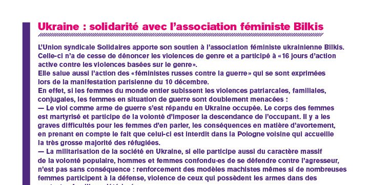 L’Union syndicale Solidaires apporte son soutien à l’association féministe ukrainienne Bilkis. Celle-ci n’a de cesse de dénoncer les violences de genre et a participé à «16 jours d'action active contre les violences basées sur le genre ».