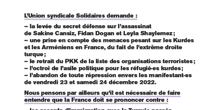 - l’abandon de toute répression envers les manifestant·es de vendredi 23 et samedi 24 décembre 2022.