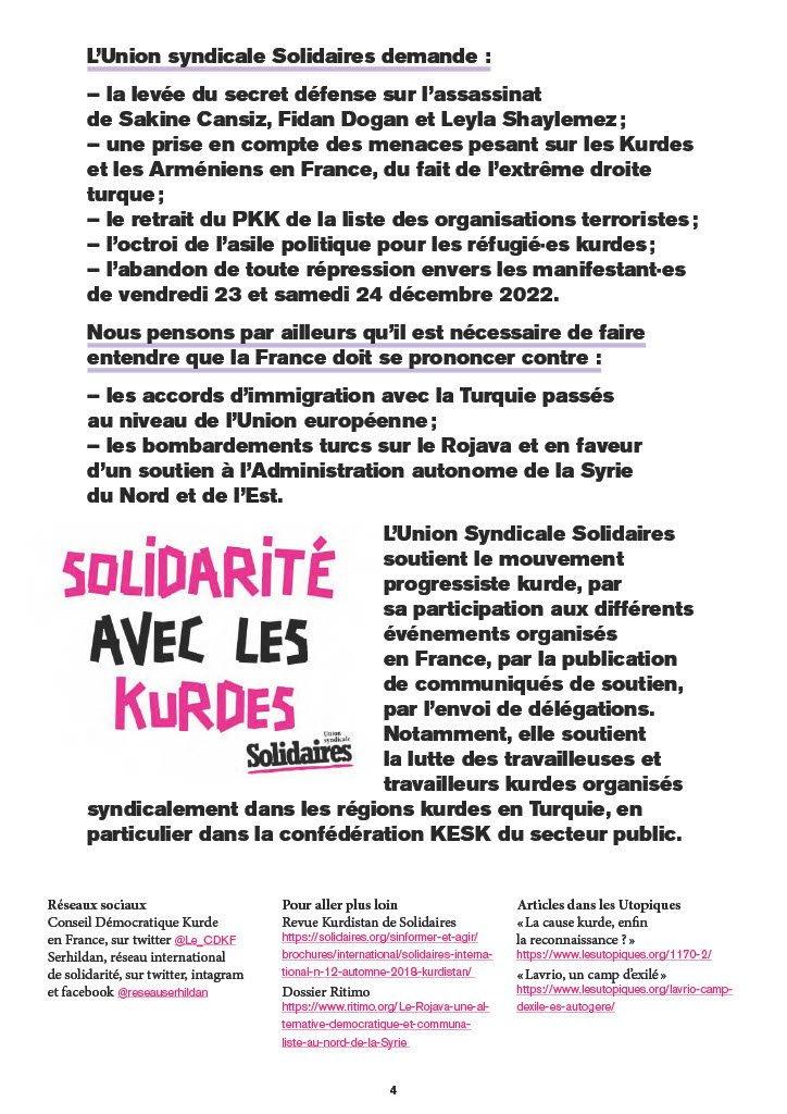 - la levée du secret défense sur l’assassinat de Sakine Cansiz, Fidan Dogan et Leyla Shaylemez